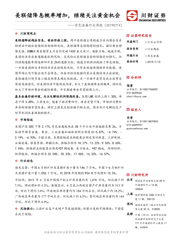 【川财证券】【20190715】20190715-川财证券-有色金属行业周报:美联储降息概率增加,继续关注黄金机会-13页