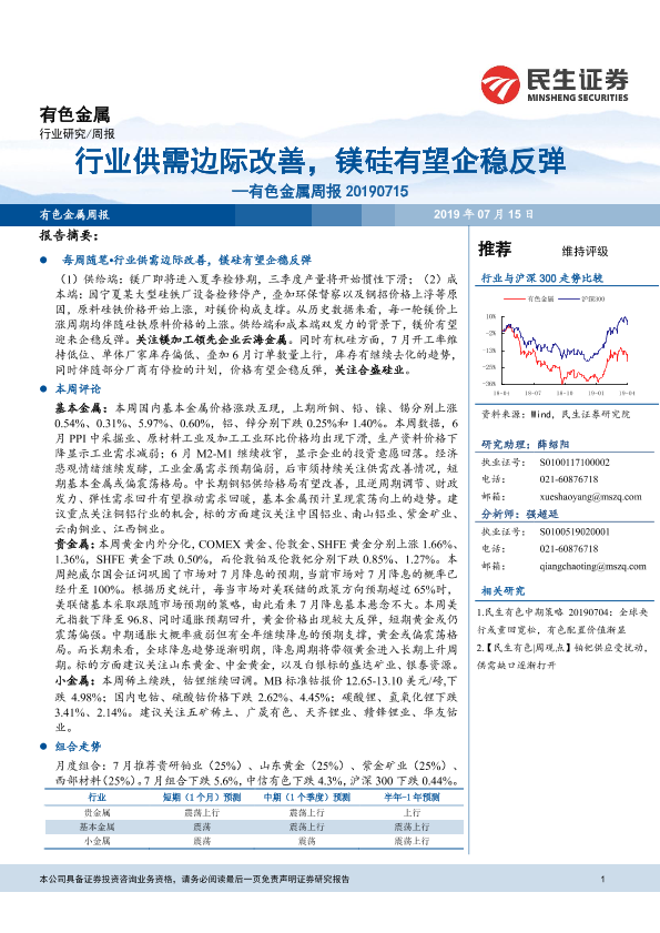 【民生证券】【20190715】20190715-民生证券-有色金属行业周报:行业供需边际改善,镁硅有望企稳反弹-31页