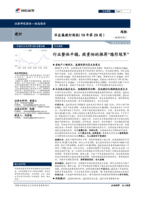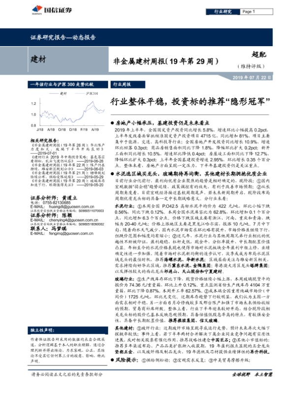 【国信证券】【20190722】20190722-国信证券-非金属建材周报(19年第29周):行业整体平稳,投资标的推荐“隐形冠军”-15页