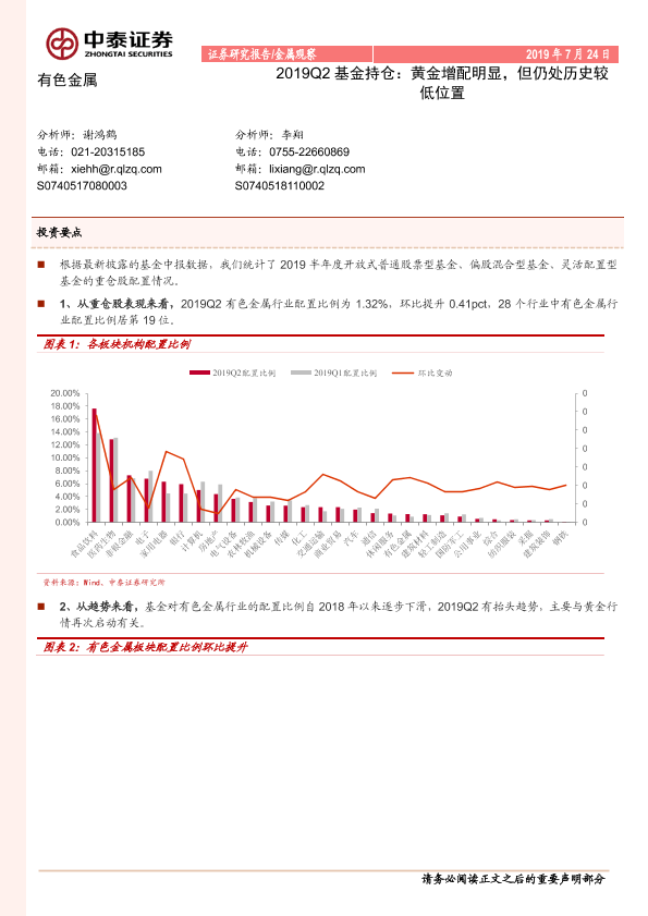 【中泰证券】【20190724】有色金属2019Q2基金持仓:黄金增配明显,但仍处历史较低位置-4页