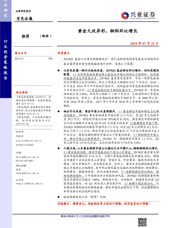 【兴业证券】【20190722】20190722-兴业证券-有色金属行业投资策略报告:黄金大放异彩,铜铝环比增长-6页