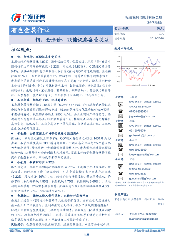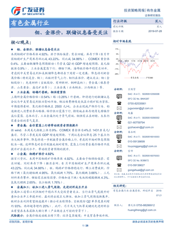【广发证券】【20190728】20190728-广发证券-有色金属行业投资策略周报:钼、金涨价,联储议息备受关注-28页