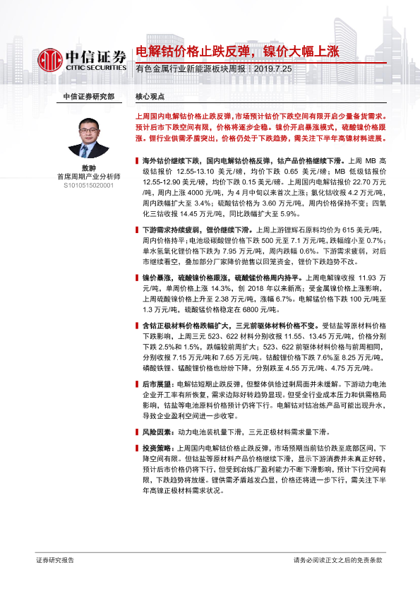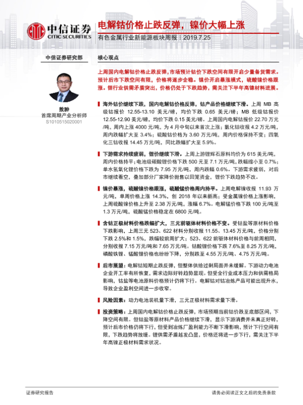 【中信证券】【20190725】20190725-中信证券-有色金属行业新能源板块周报:电解钴价格止跌反弹,镍价大幅上涨-14页