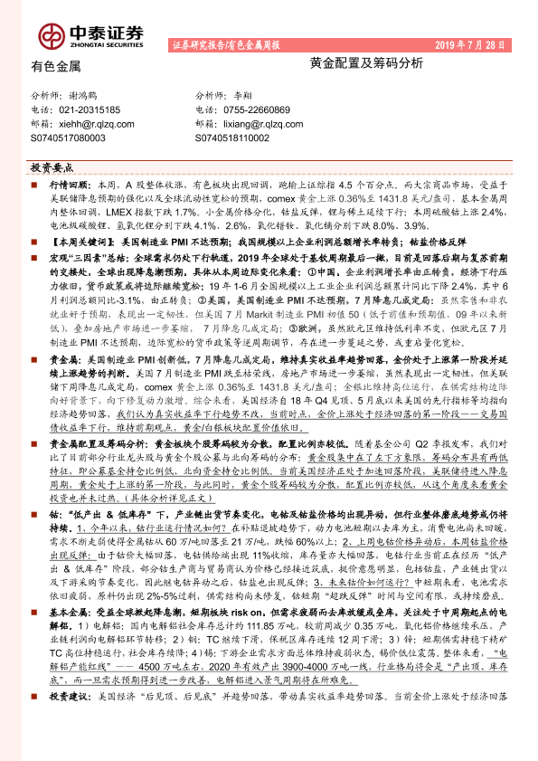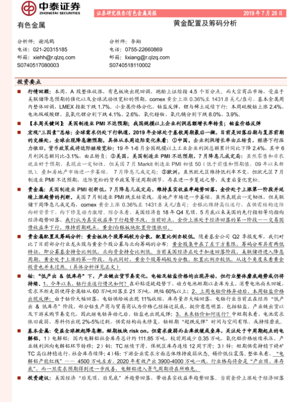 【中泰证券】【20190728】20190728-中泰证券-有色金属周报:黄金配置及筹码分析-28页