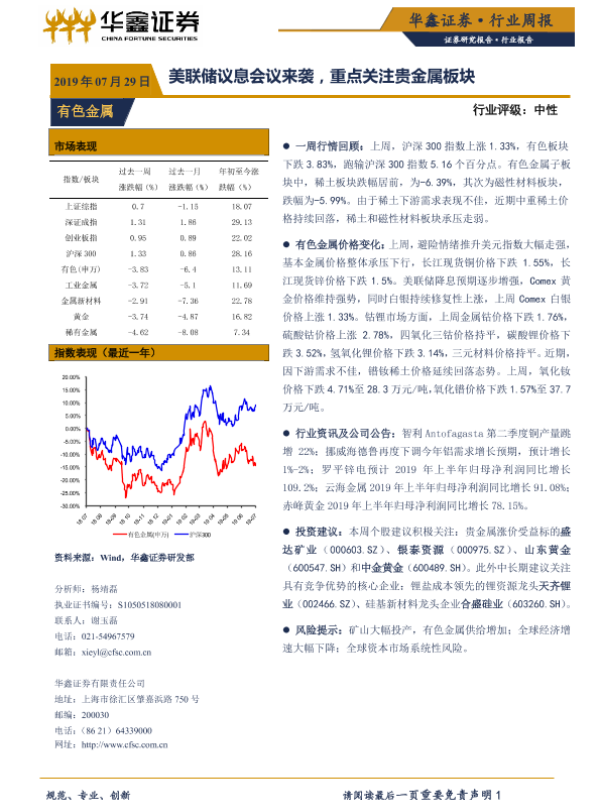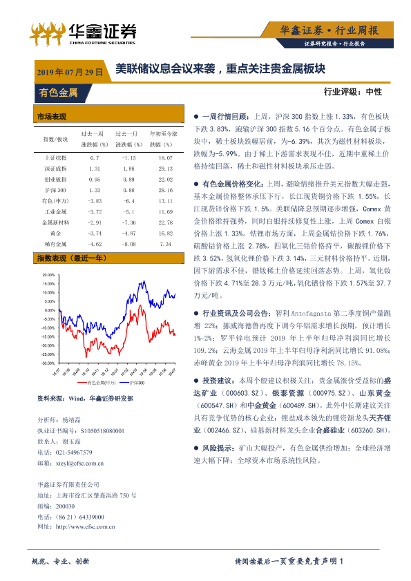 【华鑫证券】【20190729】20190729-华鑫证券-有色金属行业周报:美联储议息会议来袭,重点关注贵金属板块-12页