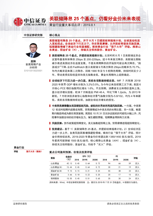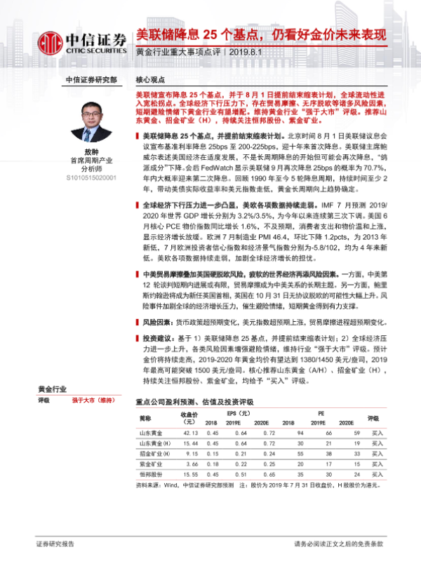 【中信证券】【20190801】美联储降息25个基点,仍看好金价未来表现-2页