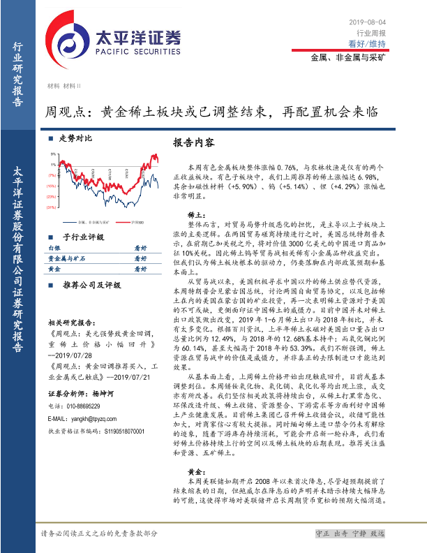 【太平洋证券】【20190804】20190804-太平洋-金属、非金属与采矿周观点:黄金稀土板块或已调整结束,再配置机会来临-4页