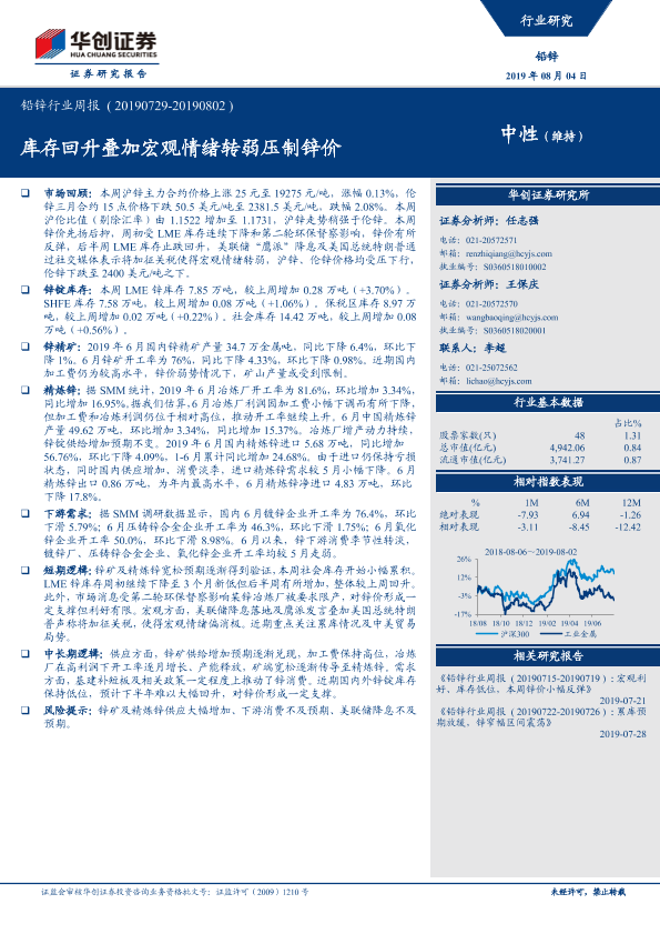 【华创证券】【20190804】20190804-华创证券-铅锌行业周报:库存回升叠加宏观情绪转弱压制锌价-18页