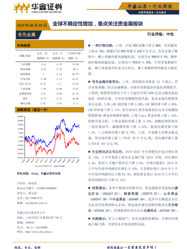 【华鑫证券】【20190805】20190805-华鑫证券-有色金属行业周报:全球不确定性增加,重点关注贵金属板块-12页
