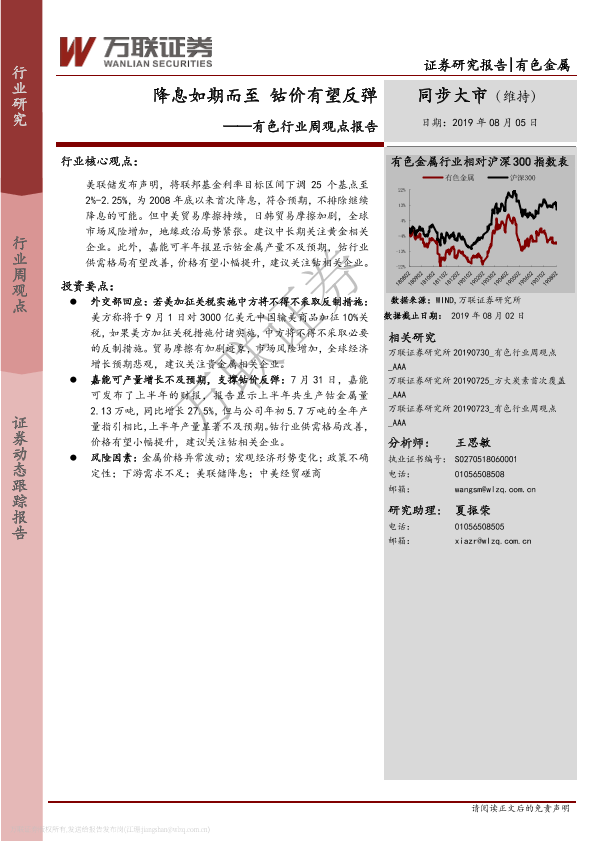 【万联证券】【20190805】20190805-万联证券-有色行业周观点报告:降息如期而至 钴价有望反弹-13页