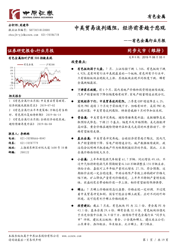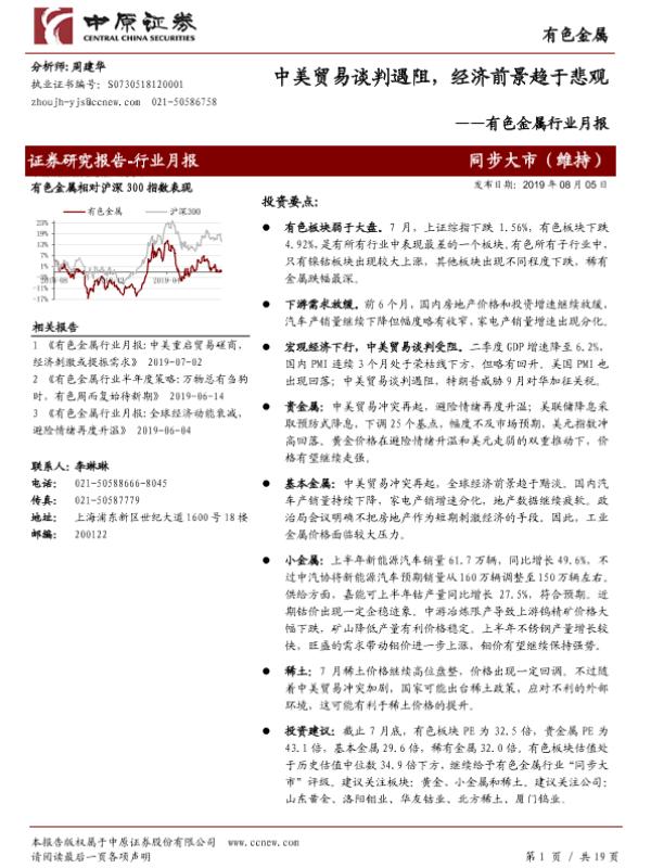 【中原证券】【20190805】20190805-中原证券-有色金属行业月报:中美贸易谈判遇阻,经济前景趋于悲观-19页