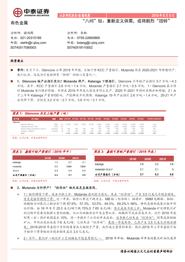 【中泰证券】【20190808】有色金属:“八问”钴:重新定义供需,或将剧烈“扭转”-6页