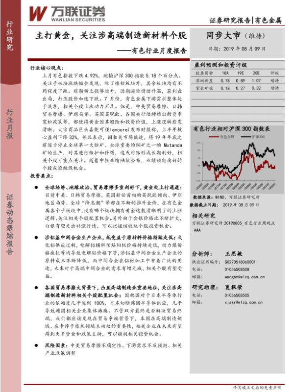 【万联证券】【20190809】20190809-万联证券-有色行业月度报告:主打黄金,关注涉高端制造新材料个股-19页