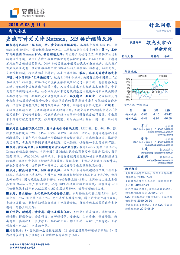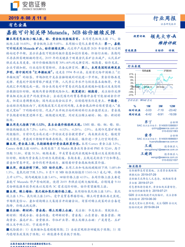 【安信证券】【20190811】20190811-安信证券-有色金属行业周报:嘉能可计划关停Mutanda,MB钴价继续反弹-24页