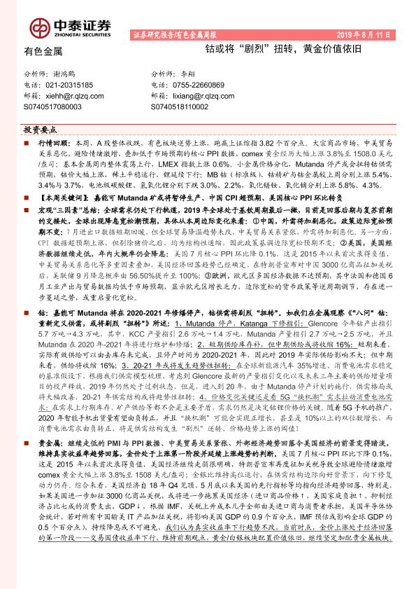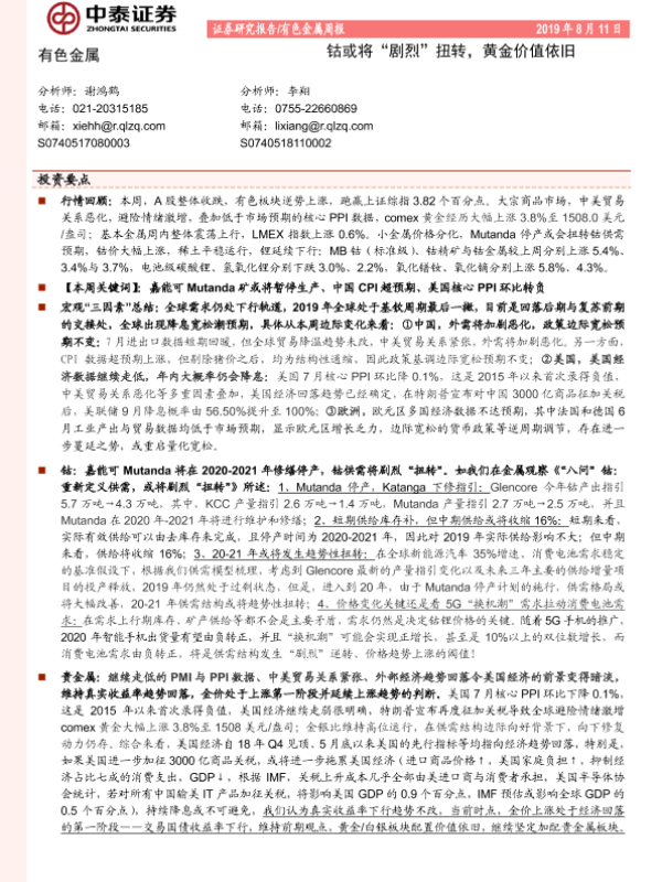 【中泰证券】【20190811】20190811-中泰证券-有色金属周报:钴或将“剧烈”扭转,黄金价值依旧-28页
