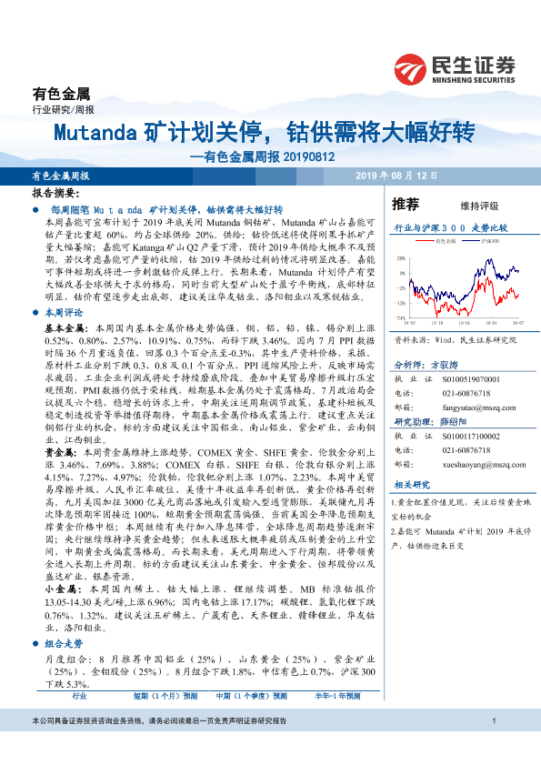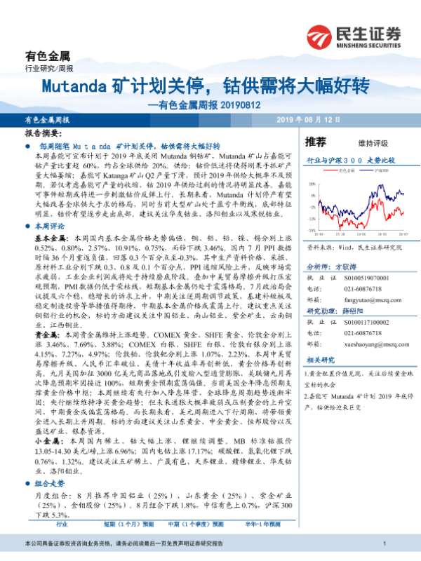 【民生证券】【20190812】20190812-民生证券-有色金属周报:Mutanda矿计划关停,钴供需将大幅好转-31页