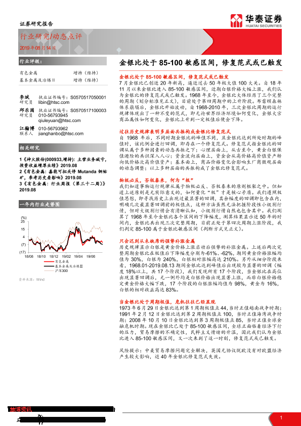 【华泰证券】【20190814】有色金属行业:金银比处于85-100敏感区间,修复范式或已触发-6页