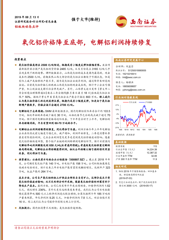 【西南证券】【20190813】铝板块动态点评:氧化铝价格降至底部,电解铝利润持续修复-3页