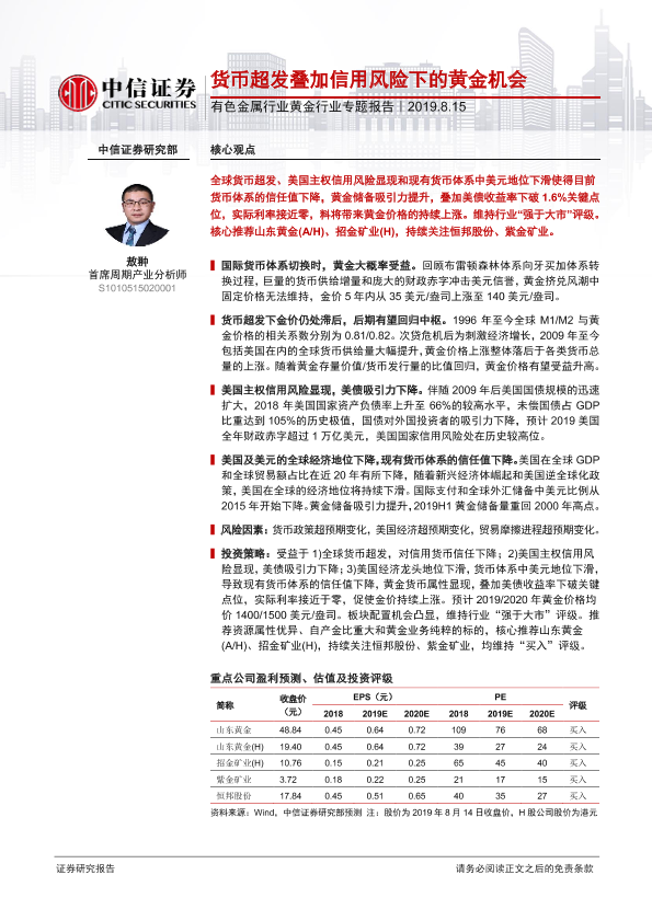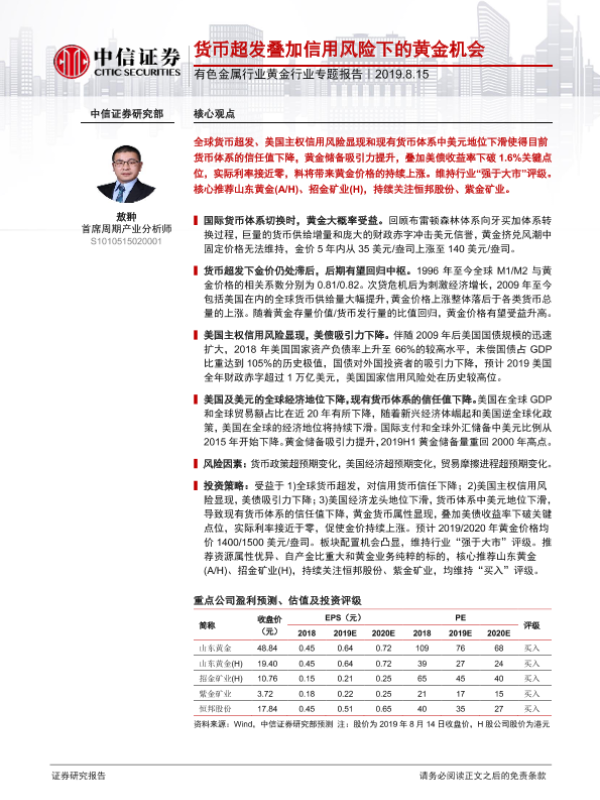 【中信证券】【20190815】有色金属行业黄金行业专题报告:货币超发叠加信用风险下的黄金机会-14页