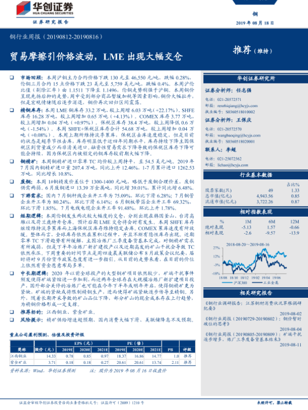 【华创证券】【20190818】20190818-华创证券-铜行业周报:贸易摩擦引价格波动,LME出现大幅交仓-18页