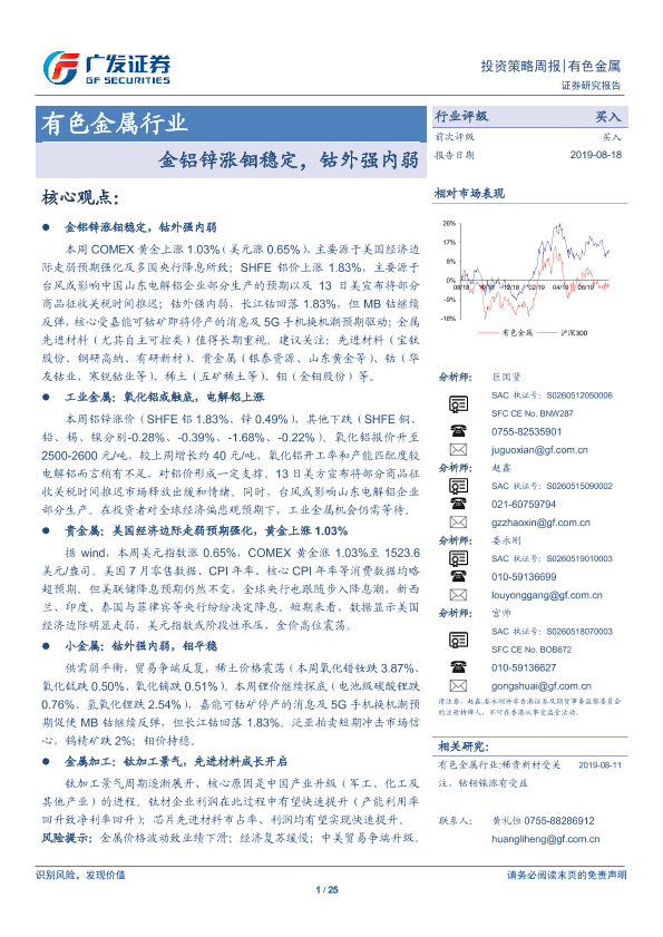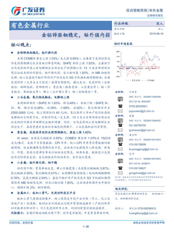 【广发证券】【20190818】20190818-广发证券-有色金属行业投资策略周报:金铝锌涨钼稳定,钴外强内弱-25页