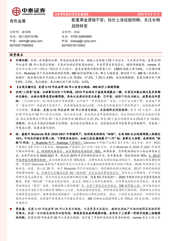 【中泰证券】【20190817】20190817-中泰证券-有色金属周报:配置黄金逻辑不变;钴价上涨或超预期,关注长期趋势转变-28页