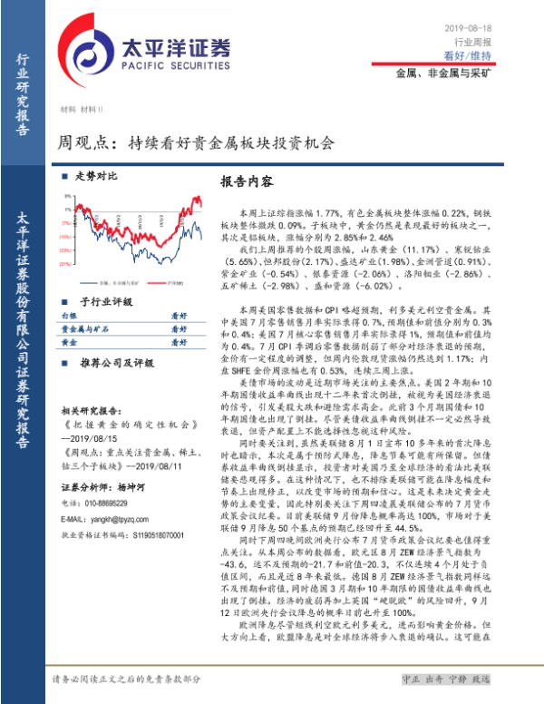 【太平洋证券】【20190818】20190818-太平洋-金属、非金属与采矿周观点:持续看好贵金属板块投资机会-4页