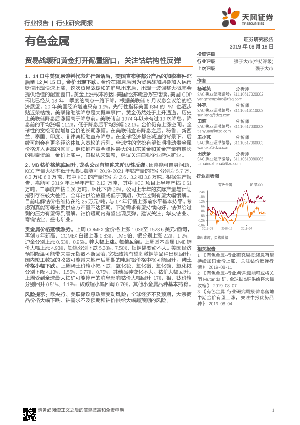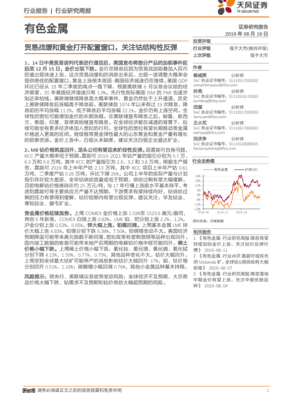 【天风证券】【20190819】20190819-天风证券-有色金属行业研究周报:贸易战缓和黄金打开配置窗口,关注钴结构性反弹-17页