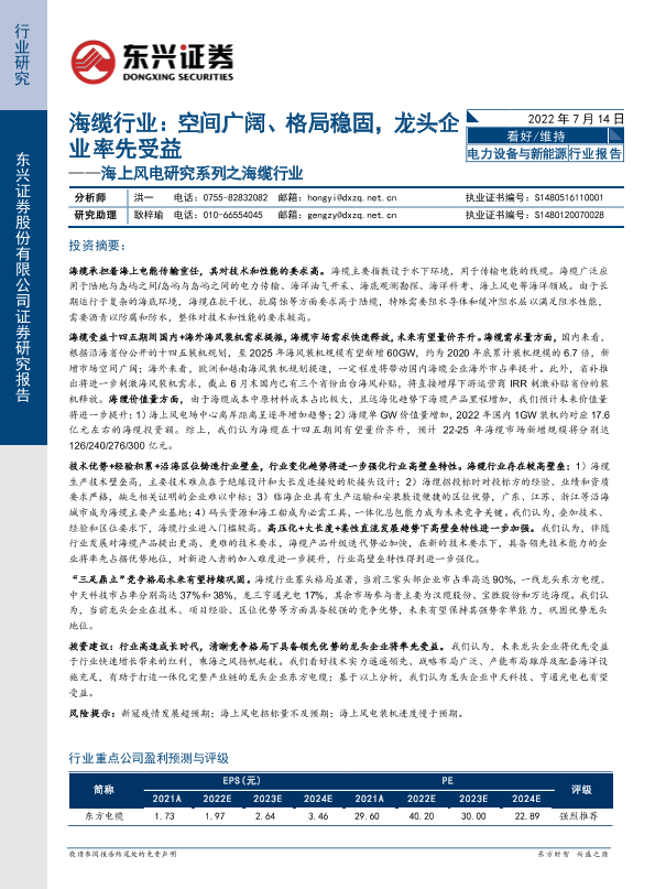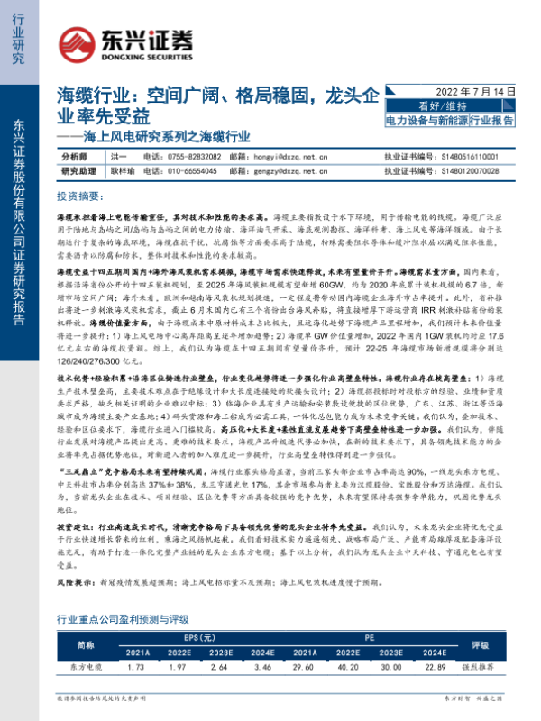 【东兴证券】【20220714】海上风电研究系列之海缆行业:空间广阔、格局稳固,龙头企业率先受益-29页