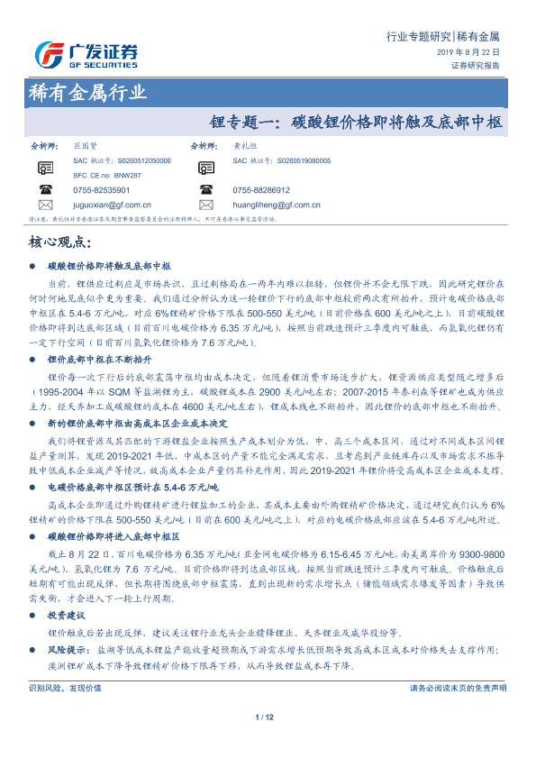 【广发证券】【20190822】稀有金属行业:锂专题一:碳酸锂价格即将触及底部中枢-12页