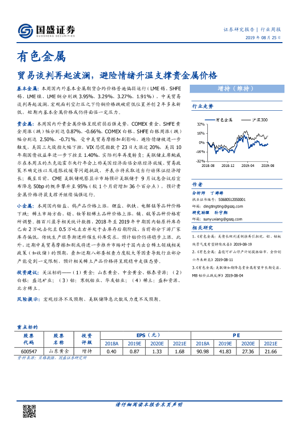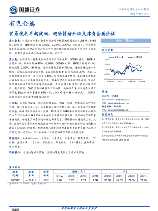 【国盛证券】【20190825】20190825-国盛证券-有色金属行业周报:贸易谈判再起波澜,避险情绪升温支撑贵金属价格-18页