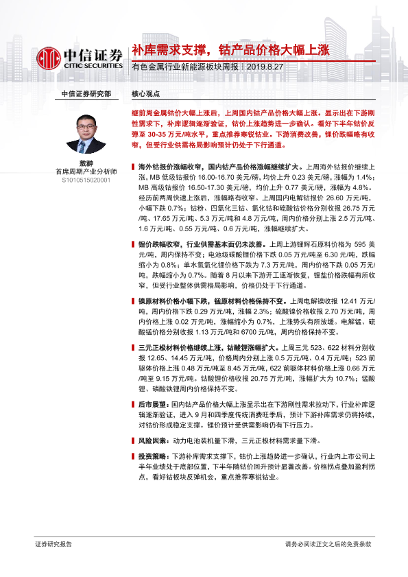【中信证券】【20190827】20190827-中信证券-有色金属行业新能源板块周报:补库需求支撑,钴产品价格大幅上涨-14页