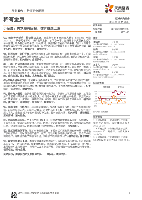 【天风证券】【20190826】20190826-天风证券-稀有金属行业研究周报:小金属:需求略有回暖,钴价继续上涨-16页