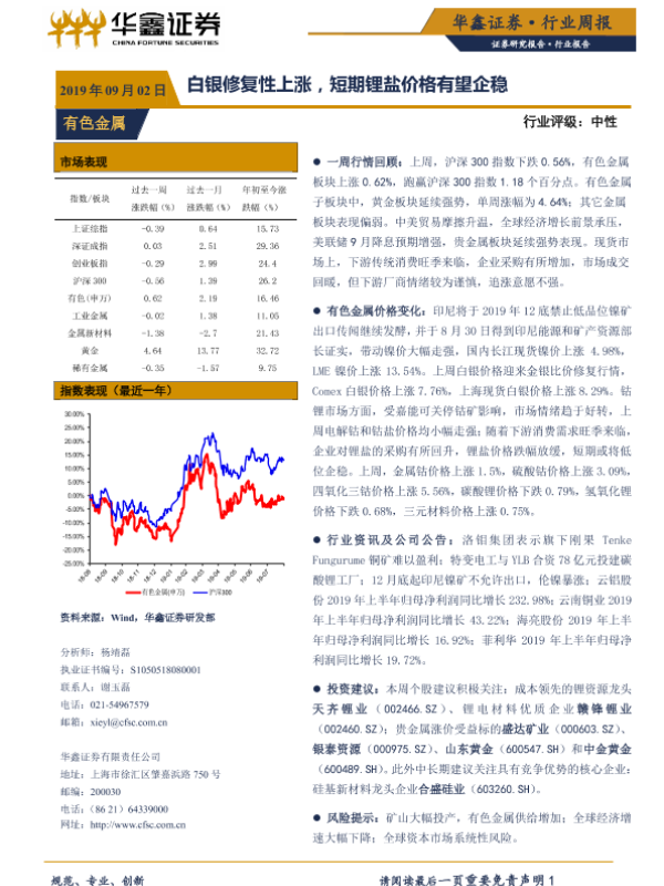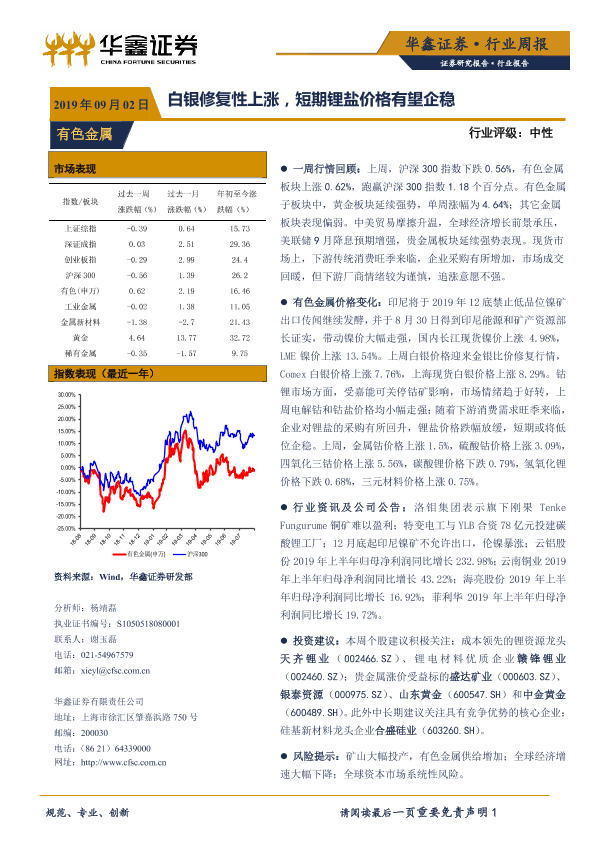 【华鑫证券】【20190902】20190902-华鑫证券-有色金属行业周报:白银修复性上涨,短期锂盐价格有望企稳-12页