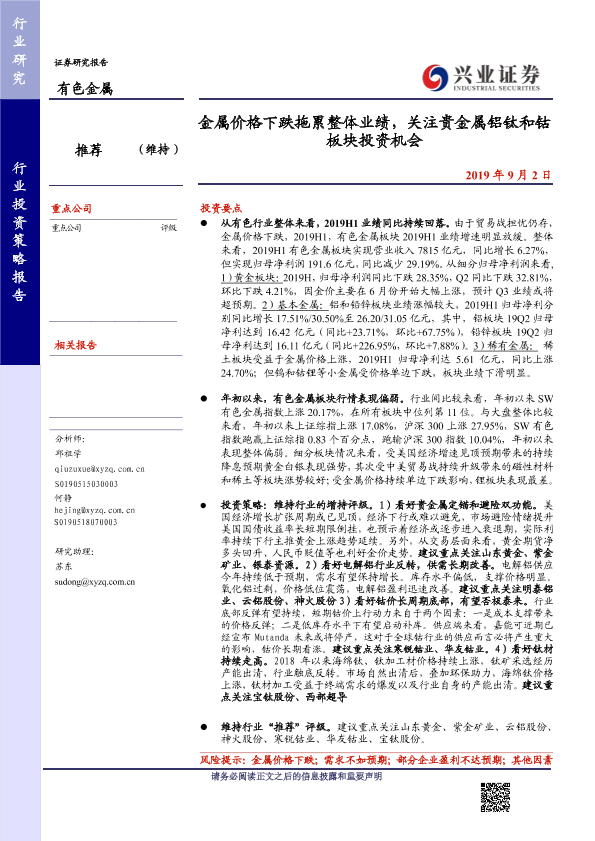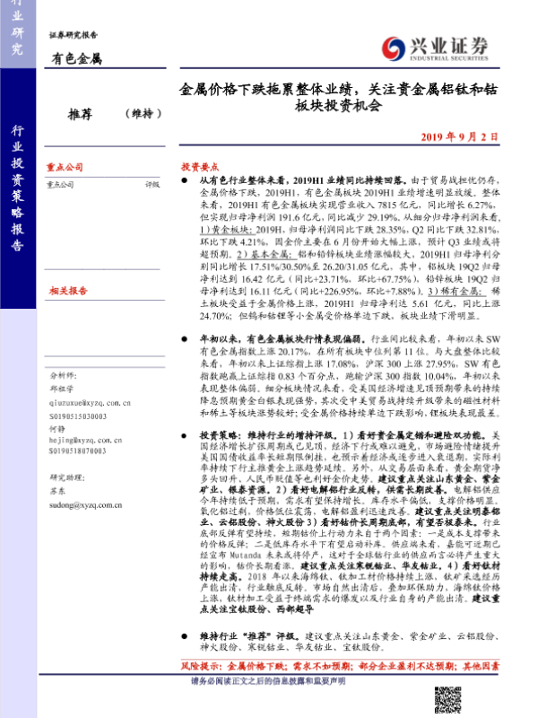 【兴业证券】【20190902】金属价格下跌拖累整体业绩,关注贵金属铝钛和钴板块投资机会-38页
