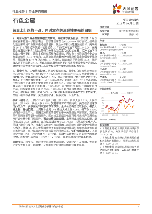 【天风证券】【20190902】20190902-天风证券-有色金属行业研究周报:黄金上行趋势不改,同时重点关注弹性更强的白银-18页