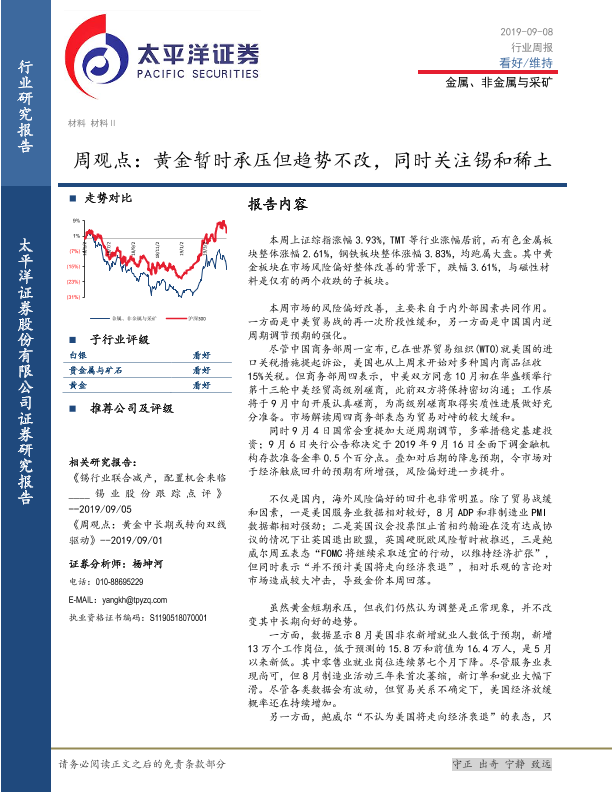 【太平洋证券】【20190908】20190908-太平洋-金属、非金属与采矿行业周观点:黄金暂时承压但趋势不改,同时关注锡和稀土-4页