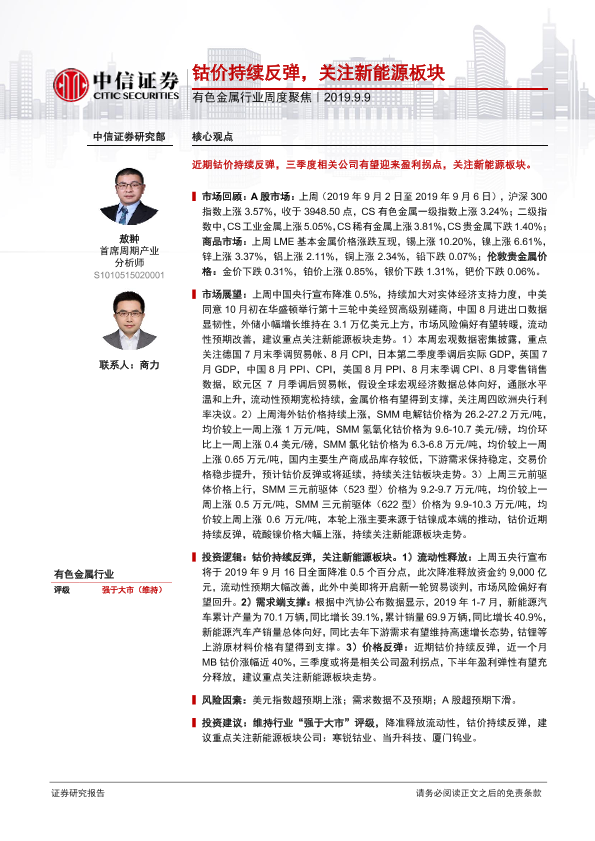 【中信证券】【20190909】20190909-中信证券-有色金属行业周度聚焦:钴价持续反弹,关注新能源板块-18页