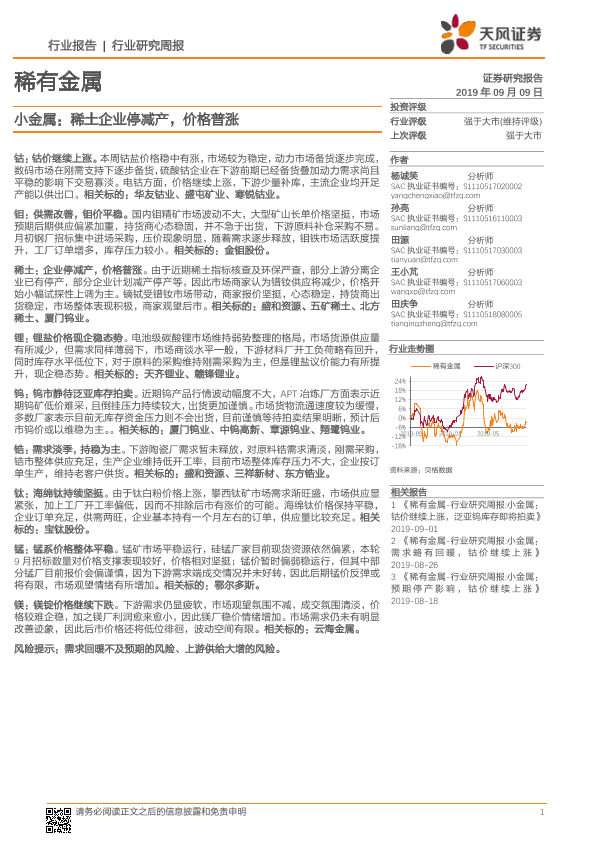 【天风证券】【20190909】20190909-天风证券-稀有金属行业研究周报:小金属:稀土企业停减产,价格普涨-16页