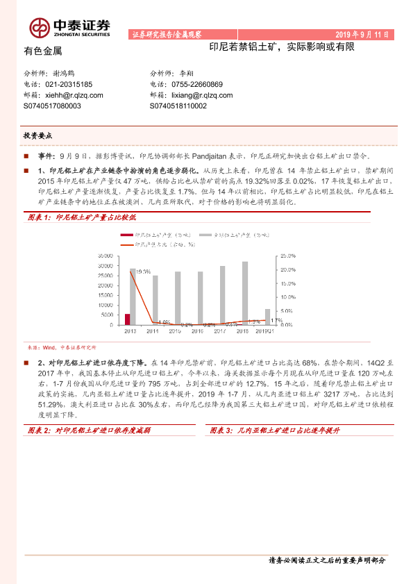 【中泰证券】【20190911】有色金属:印尼若禁铝土矿,实际影响或有限-4页
