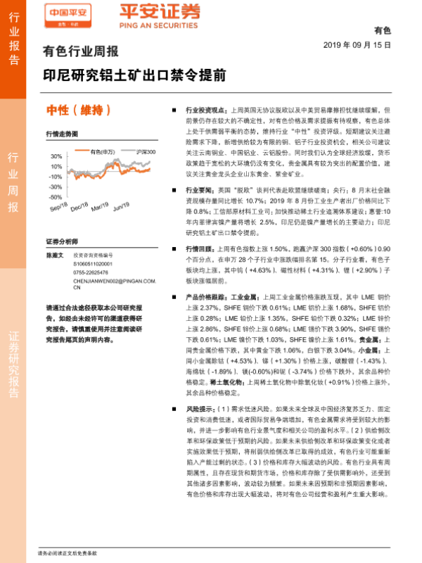 【平安证券】【20190915】20190915-平安证券-有色行业周报:印尼研究铝土矿出口禁令提前-5页