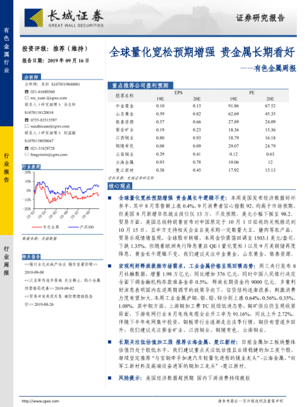 【长城证券】【20190916】20190916-长城证券-有色金属周报:全球量化宽松预期增强 贵金属长期看好-11页