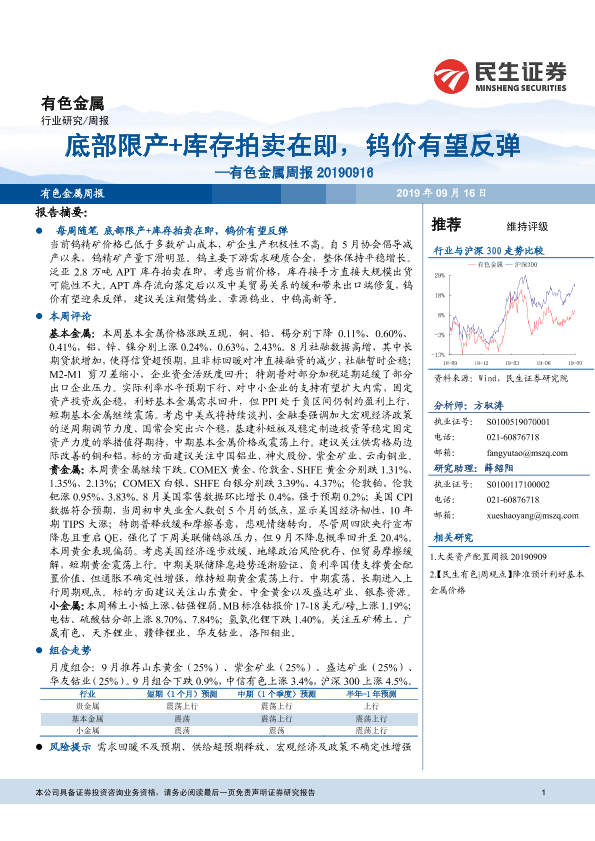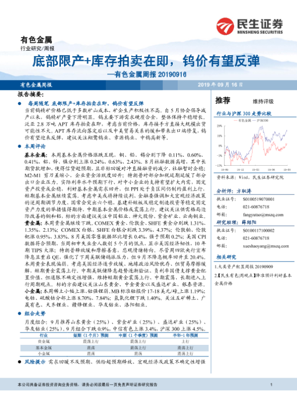 【民生证券】【20190916】20190916-民生证券-有色金属周报:底部限产+库存拍卖在即,钨价有望反弹-32页