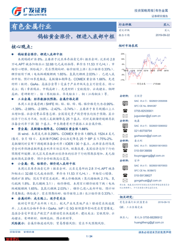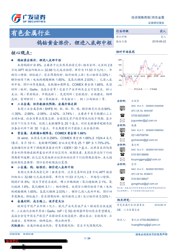 【广发证券】【20190922】20190922-广发证券-有色金属行业投资策略周报:钨钴黄金涨价,锂进入底部中枢-24页