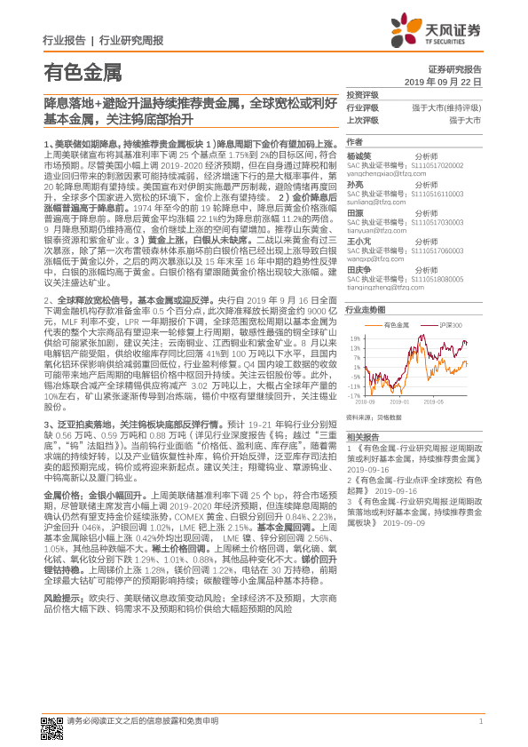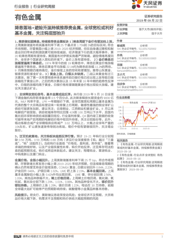 【天风证券】【20190922】20190922-天风证券-有色金属行业研究周报:降息落地+避险升温持续推荐贵金属,全球宽松或利好基本金属,关注钨底部抬升-13页