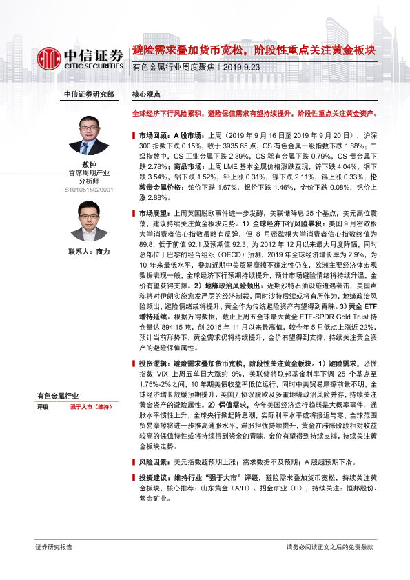 【中信证券】【20190923】20190923-中信证券-有色金属行业周度聚焦:避险需求叠加货币宽松,阶段性重点关注黄金板块-18页