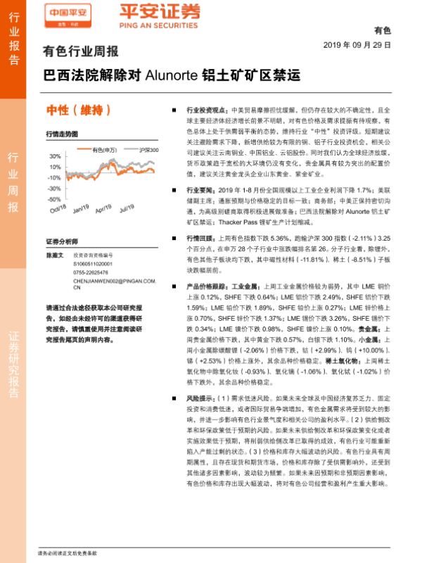 【平安证券】【20190929】有色行业周报:巴西法院解除对Alunorte铝土矿矿区禁运-5页