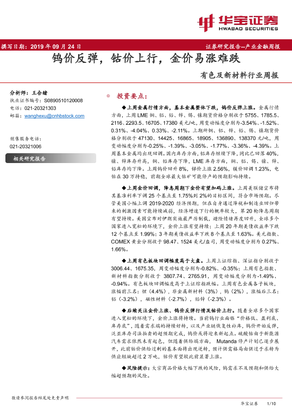 【华宝证券】【20190924】20190924-华宝证券-有色及新材料行业周报:钨价反弹,钴价上行,金价易涨难跌-10页