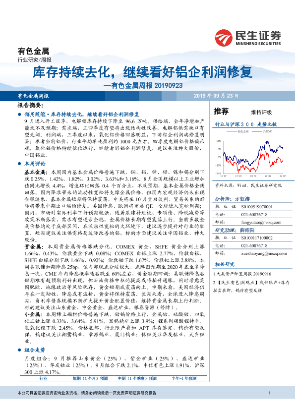 【民生证券】【20190923】20190923-民生证券-有色金属周报:库存持续去化,继续看好铝企利润修复-31页