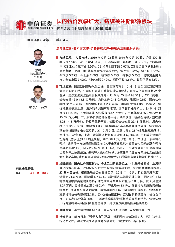 【中信证券】【20191008】20191008-中信证券-有色金属行业周度聚焦:国内钴价涨幅扩大,持续关注新能源板块-18页